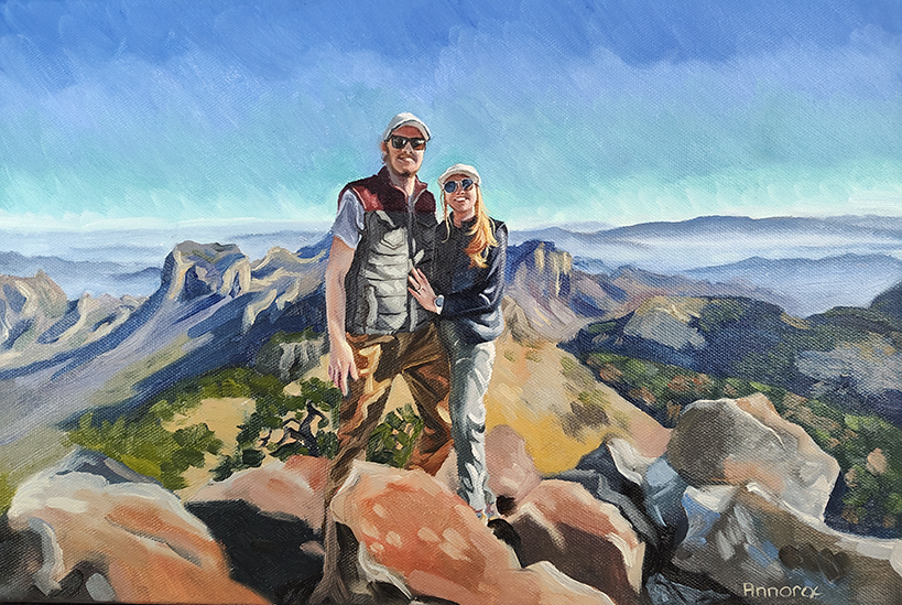 This painting was born at the summit of Emory Peak in Big Bend National Park, TX. After an amazing hike to the summit, I met a couple celebrating their upcoming wedding. I snapped a photo of them at the top, and later, Tye—the bride—commissioned me to turn that moment into a painting as a wedding gift for her husband. It’s a piece rooted in adventure, connection, and love.