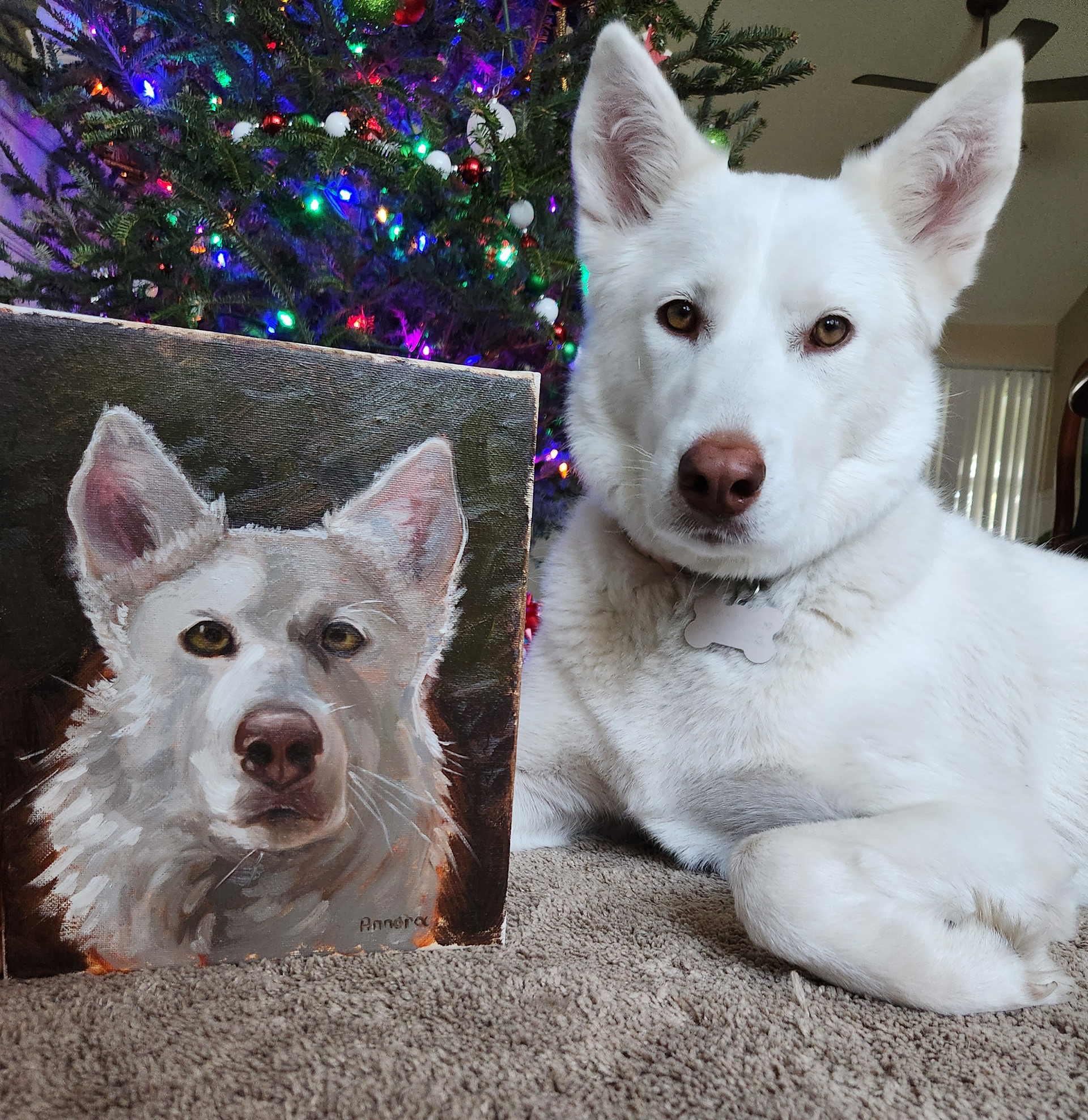 A snowy white German Shepherd Husky mix named Koa on an 8x10 canvas.