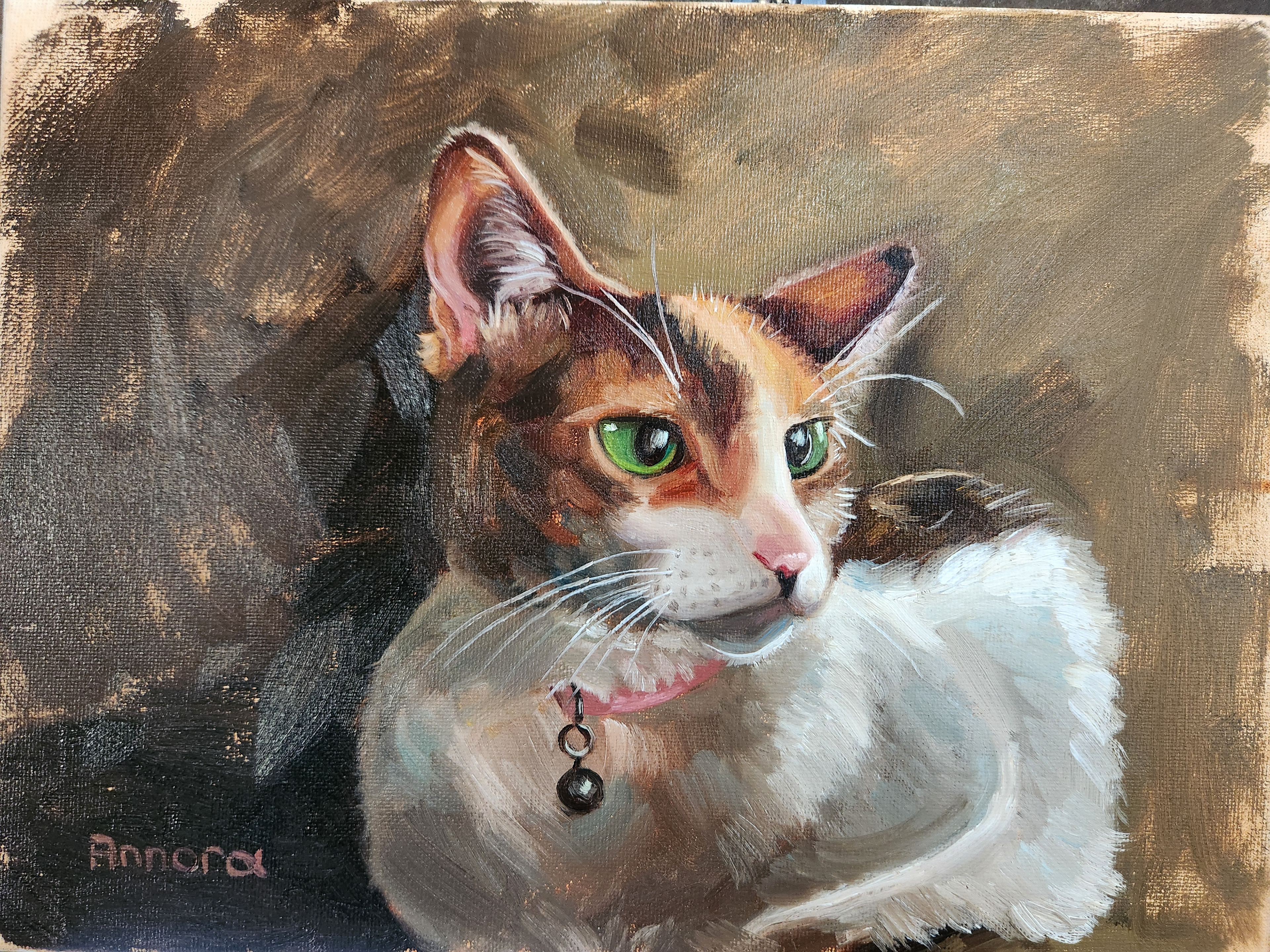 A Calico cat named Tuna on an 11" x 12" canvas.