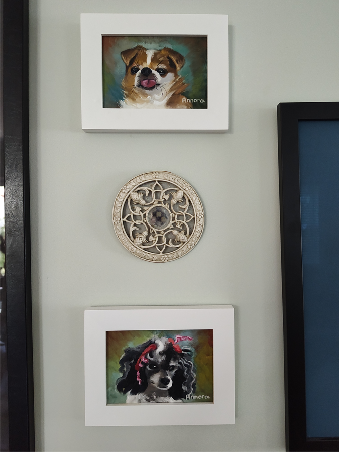 Luigi and Annie on 5" x 7" canvases—after designing a gallery wall for my client, she asked me to paint her two pups to complete the space. These mini portraits were the perfect final touch!