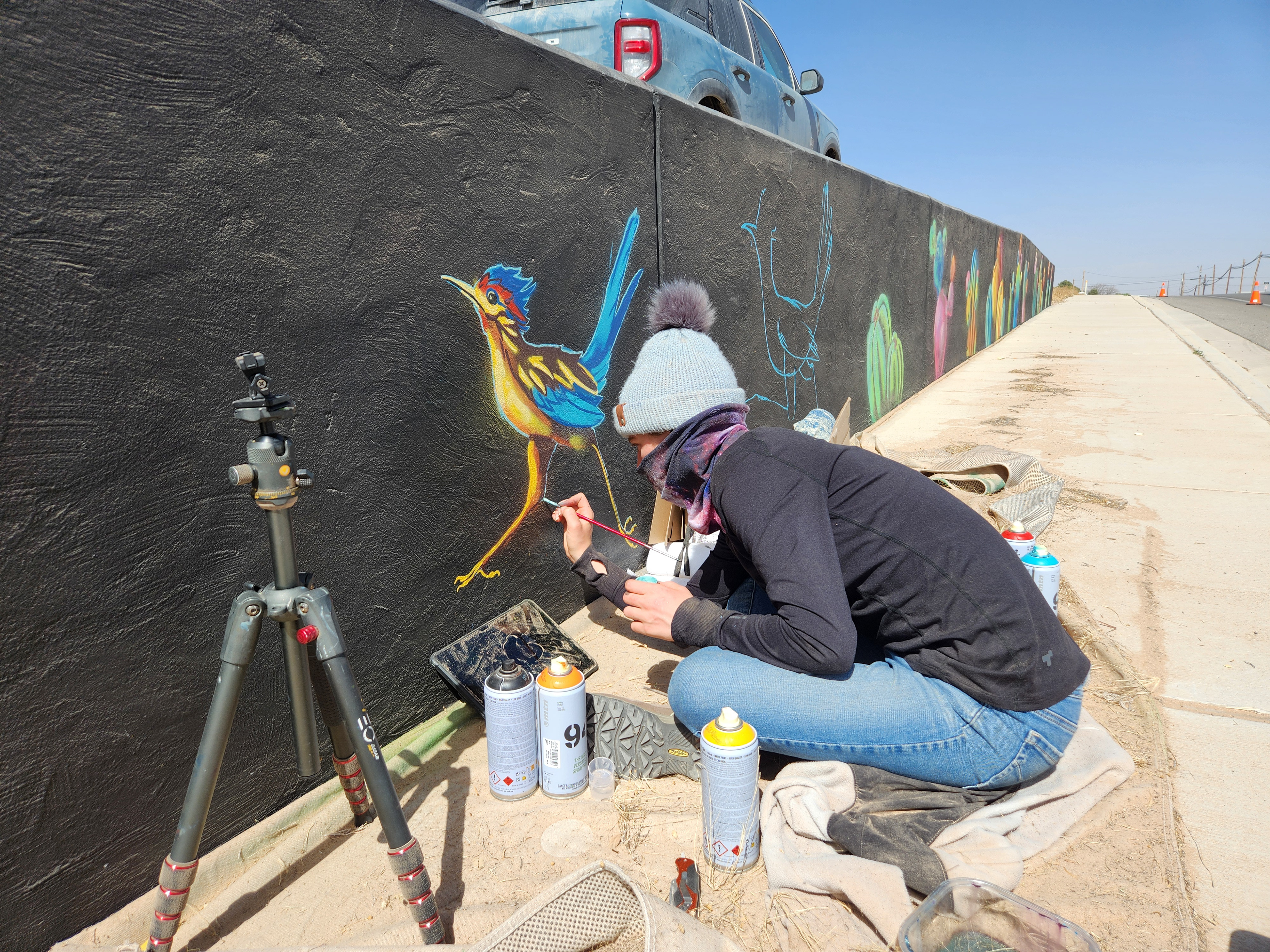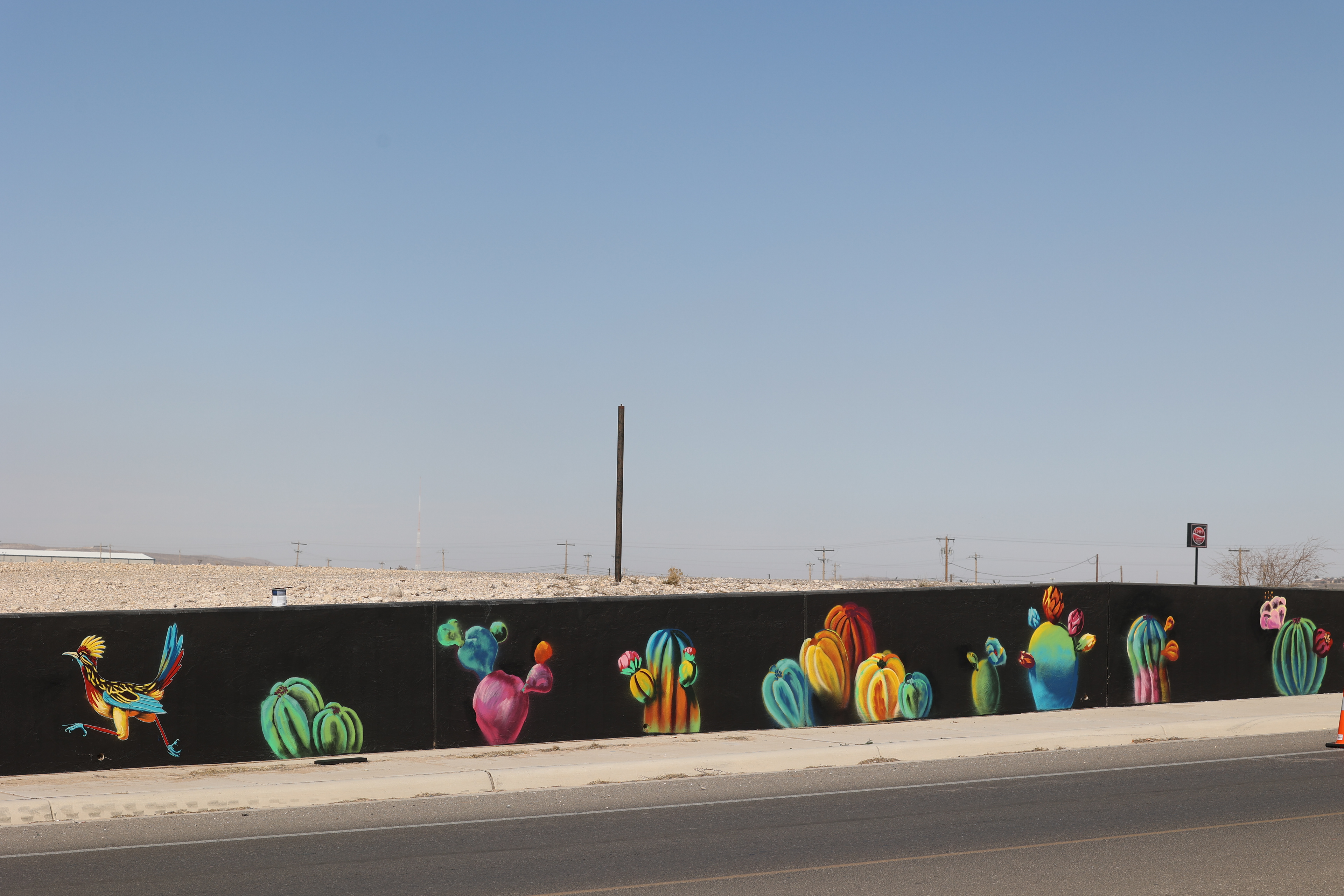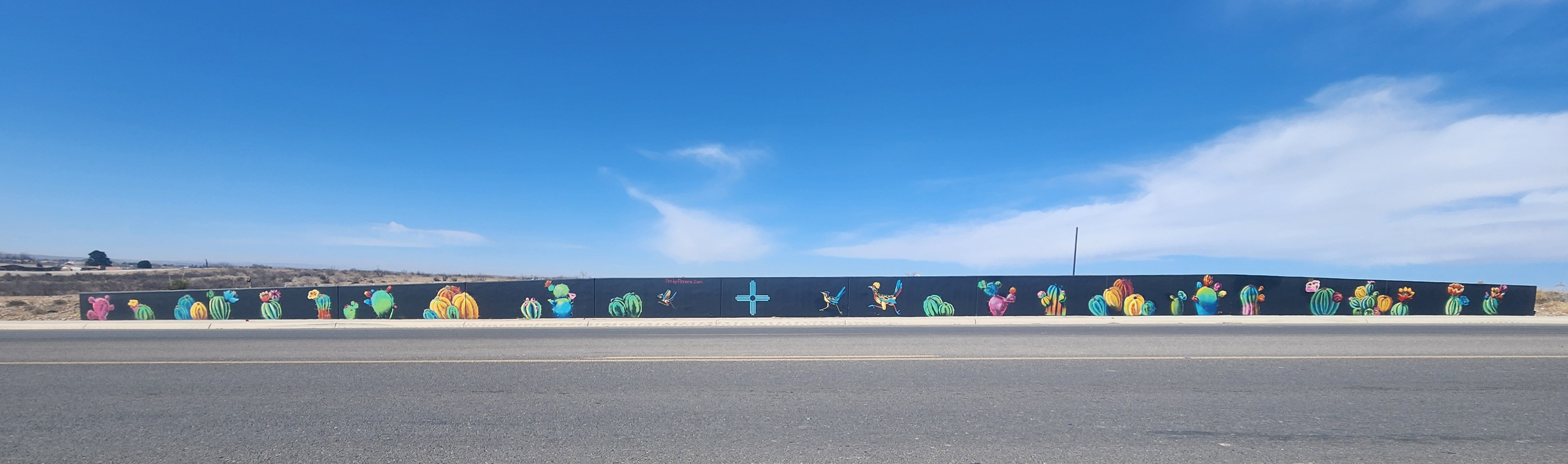 I was commissioned by City Beautification Coordinator Mary Garwood to design and install a mural for the Carlsbad community. The mural stretched along a 127ft wall located on one of Carlsbad's main roadways. The mural celebrated New Mexico’s vibrant plant and animal life. The piece was painted in bold poppy colors, and brought color, energy and joy to the heart of Carlsbad!