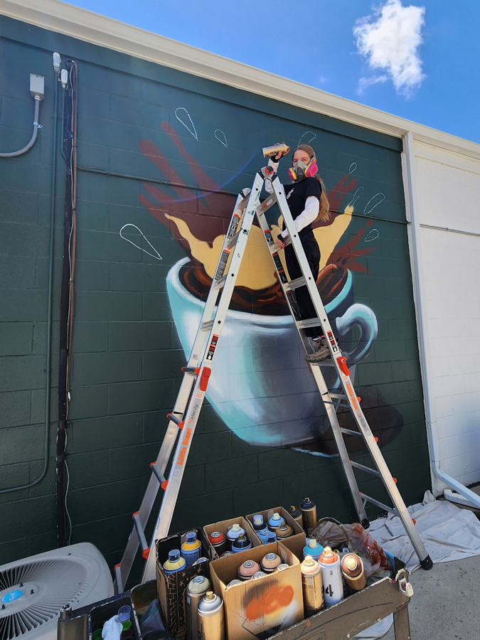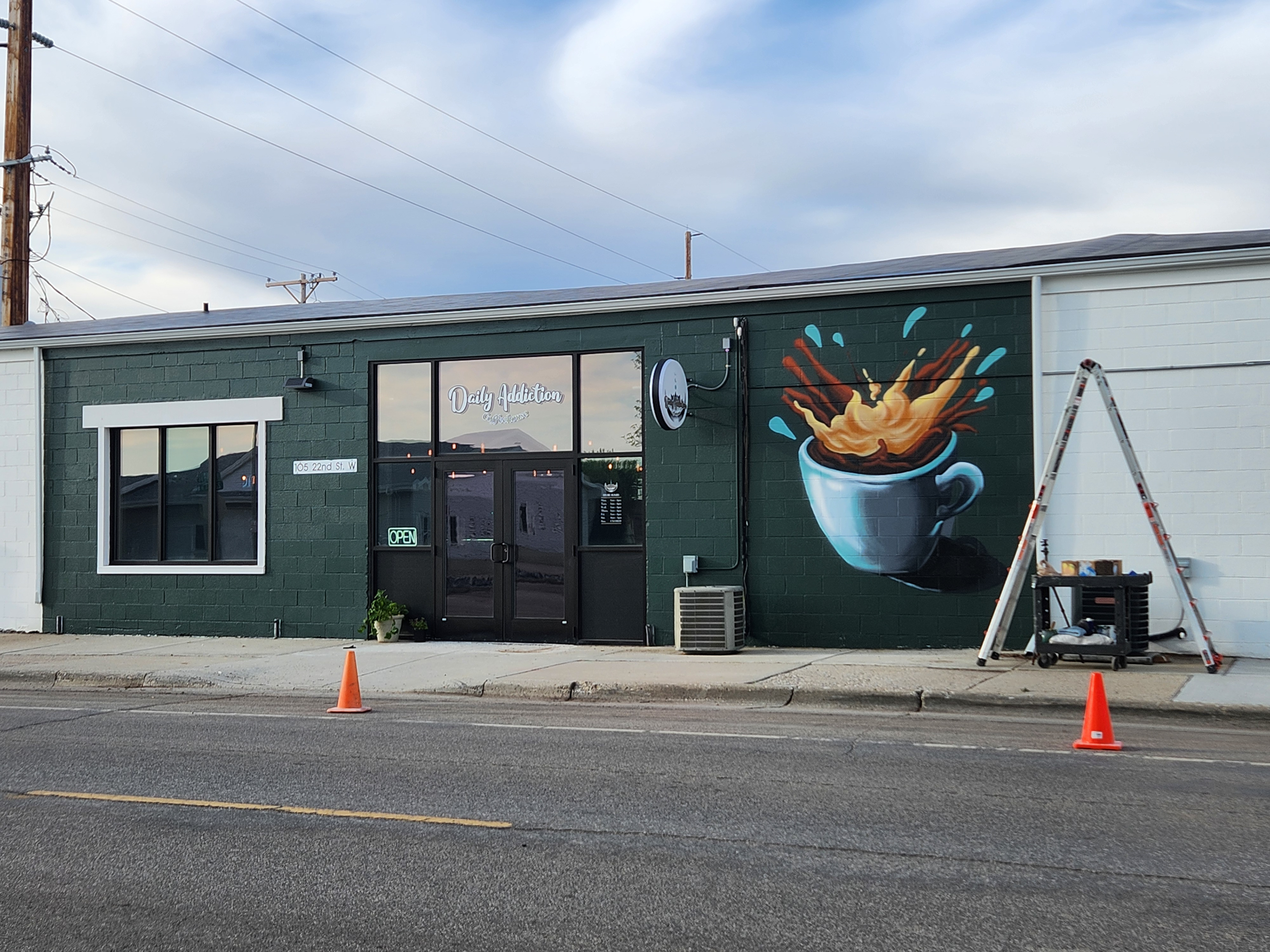 Huge coffee cup mural on the Daily Addiction Coffee House.